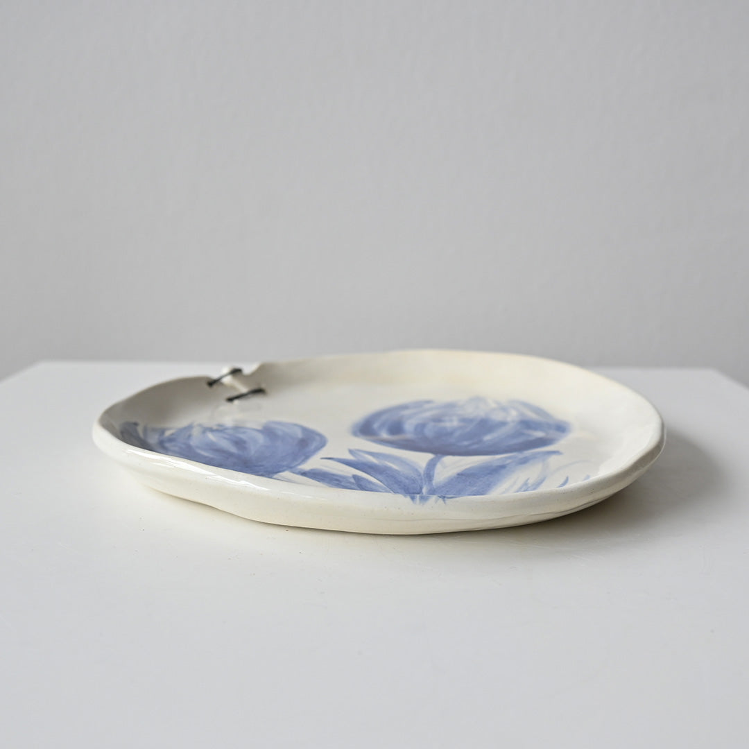This hand-built ceramic plate features a fluid, cobalt-painted floral motif, applied with expressive brushstrokes that give the design a vibrant, organic feel. The softly irregular rim highlights its handmade character, while a distinctive stitched-style detail at the top adds a unique sculptural accent. A refined blend of artistry, and subtle imperfection.