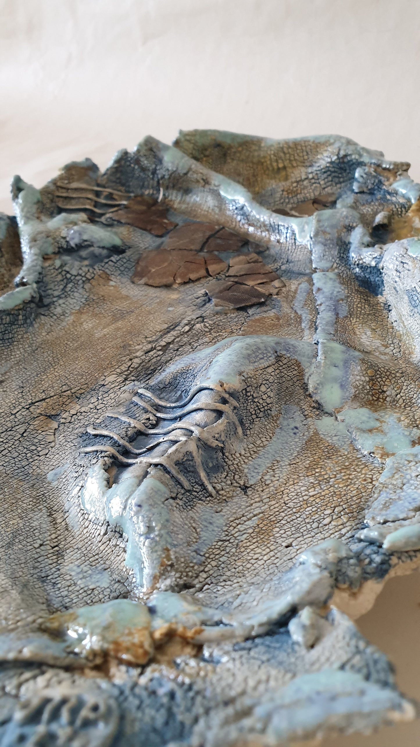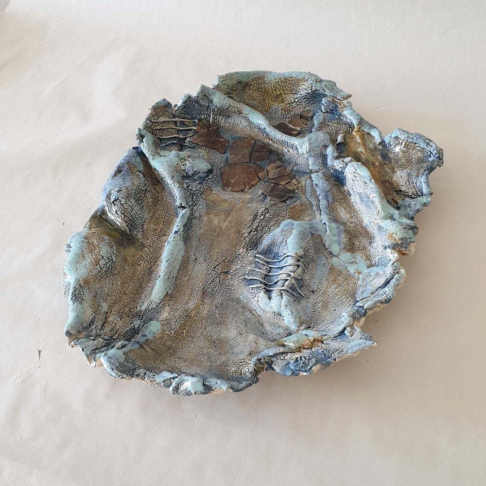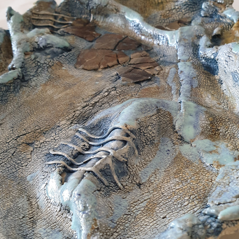 Technique: Kiln-fired ceramic with textured glaze and oxide accents
