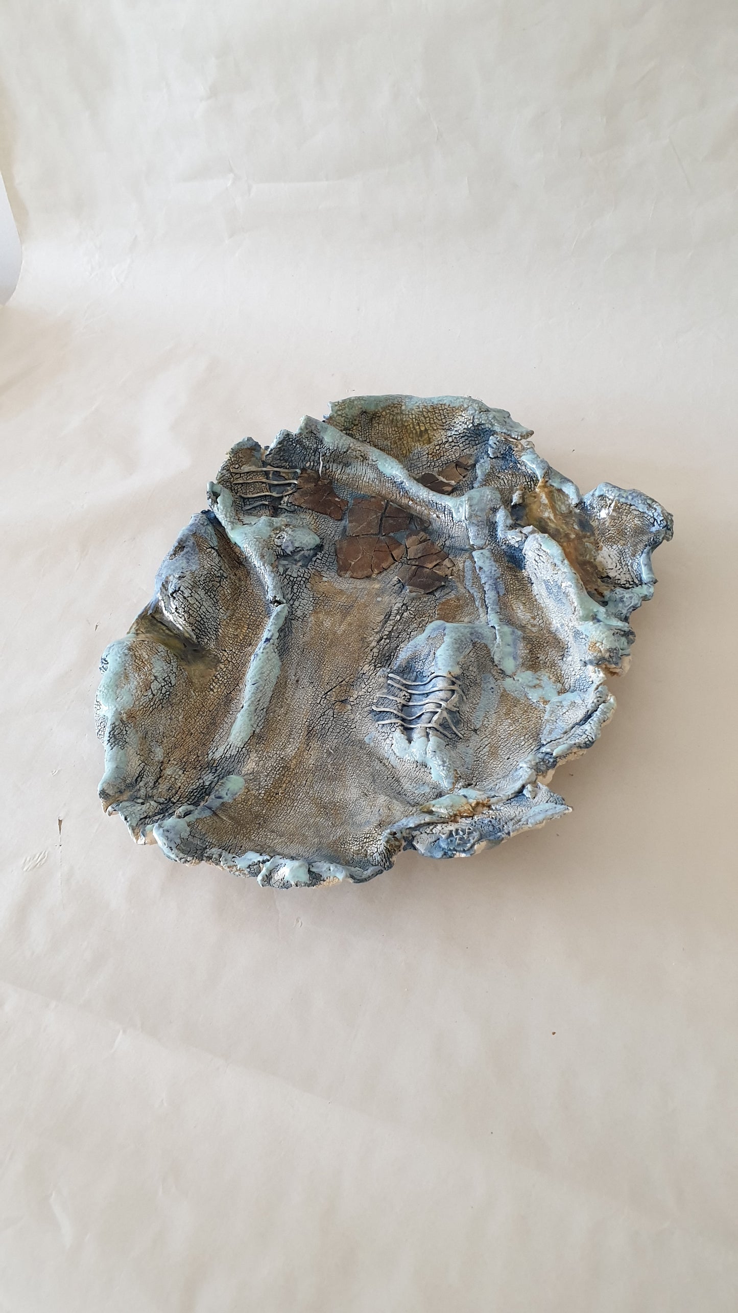 The earthy tones blended with deep blue accents evoke a sense of transformation—where land meets water, and time leaves its mark.