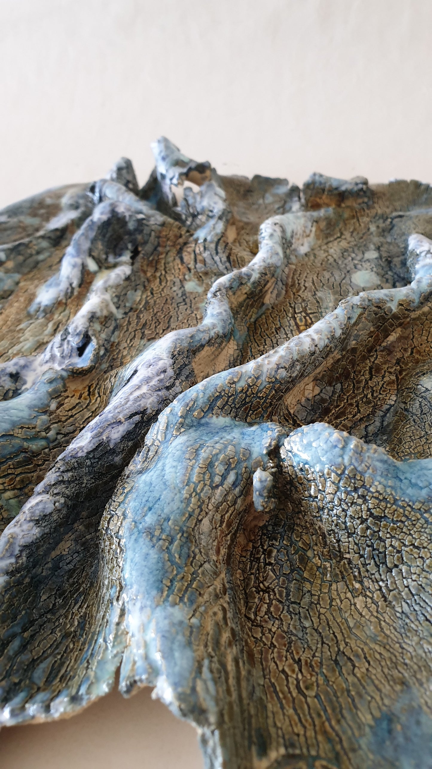 Each piece is unique, with warm earth tones and cool blue hues blending naturally, offering a different experience from every angle.