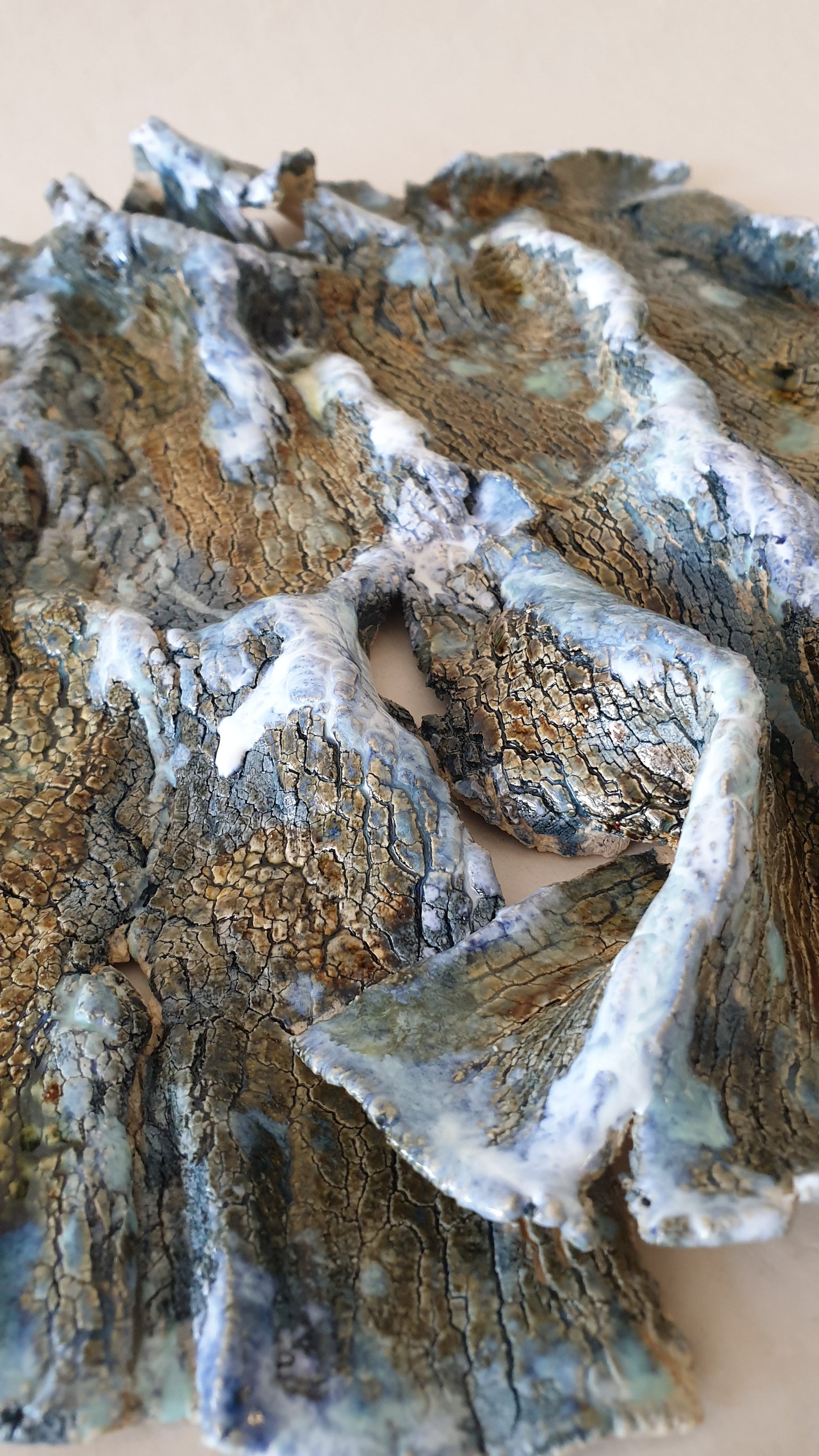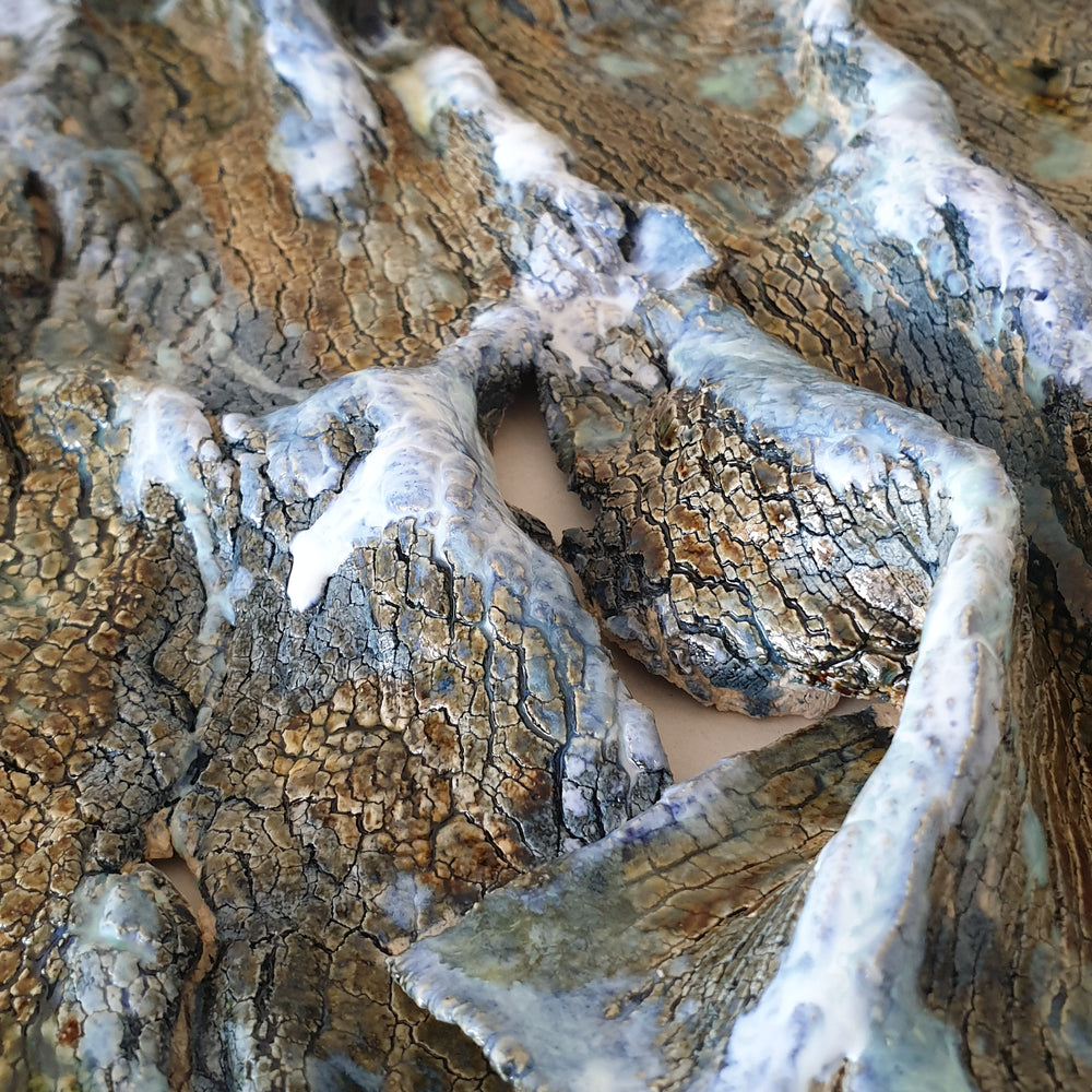 Technique: Kiln-fired ceramic with textured glaze and oxide accents