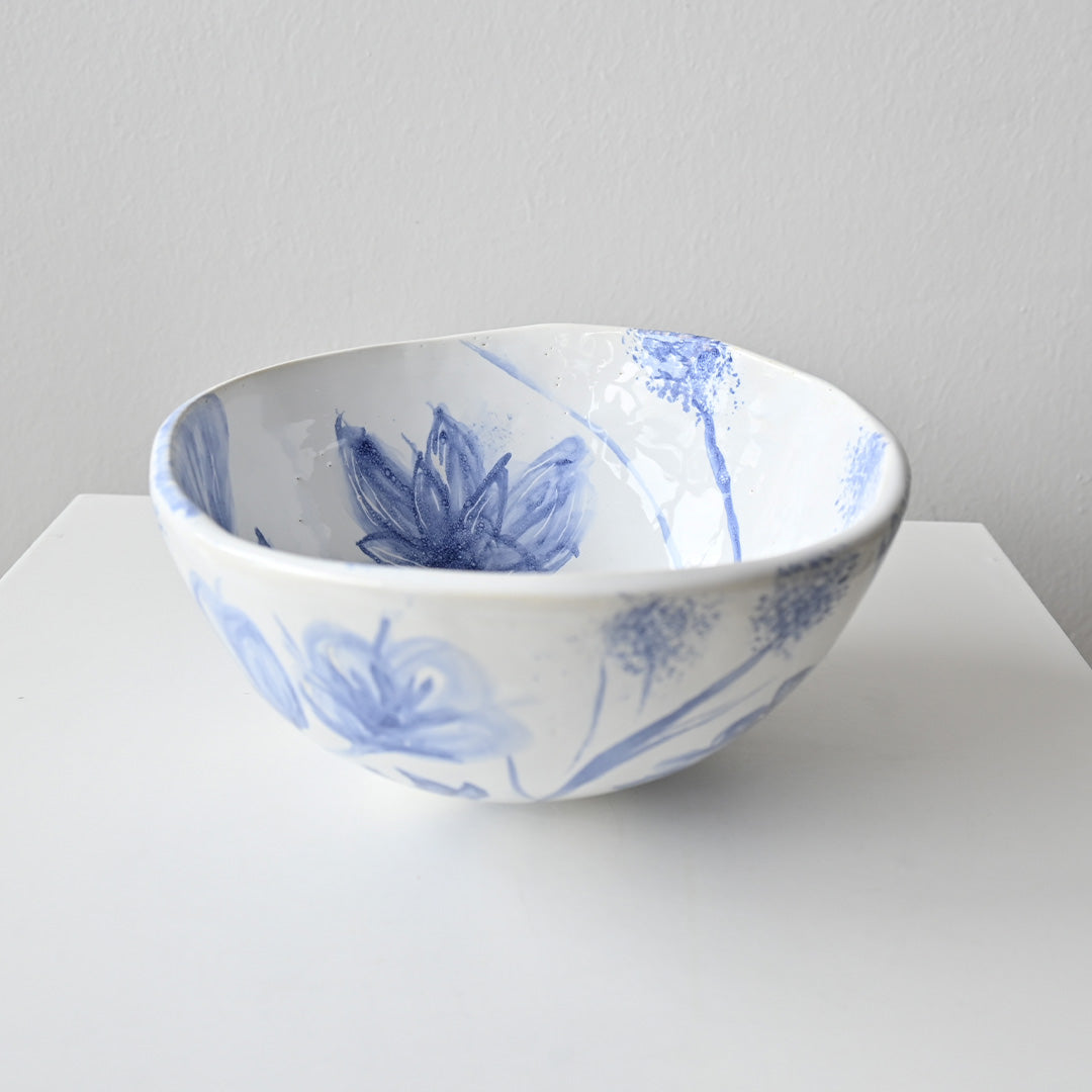 A hand-shaped ceramic bowl painted with a field of cobalt flowers—an intimate garden blooming across its organic form.