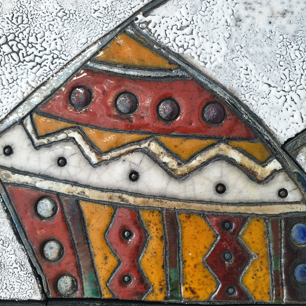 Tradition in the Earth – Traces of Heritage represents the deep cultural roots of the Albanian people. Its fragmented shapes and vibrant colors symbolize history’s continuous transformation, blending traditional motifs with a modern mosaic-like composition.