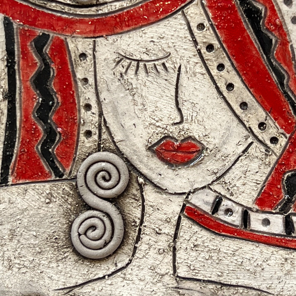 The red paint is not mere decoration — it mirrors the sacred bloodlines of Illyrian mothers, warriors and healers. Her image recalls the Goddess of Fertility, found on ancient Illyrian stone carvings, where women were honored as life-bringers and defenders of the land.