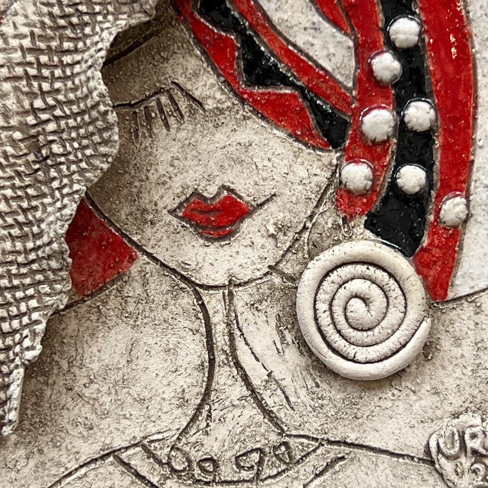 Her jewelry and textile-like textures are not ornaments, but talismans of continuity